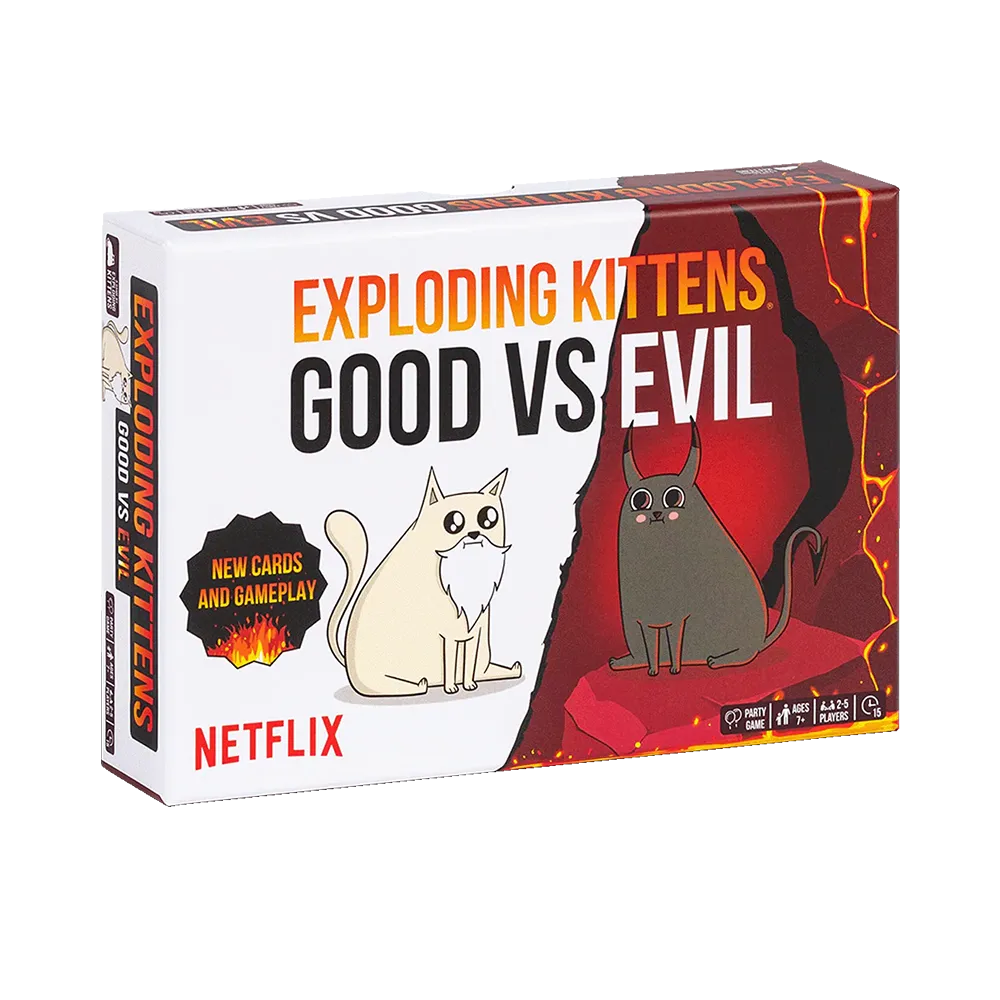 Exploding kittens good vs evil donosi potpuno nove likove iz naše prve Netflix serije. Ova igra sa visokim ulozima ruskog ruleta omogućava ti da nadmudriš svoje prijatelje sve dok pokušavaš da ne eksplodiraš. Dodate su kartice Armagedon koje pokreću ekskluzivnu mini-igru u kojoj se igrači bore za posedovanje najmoćnije karte.